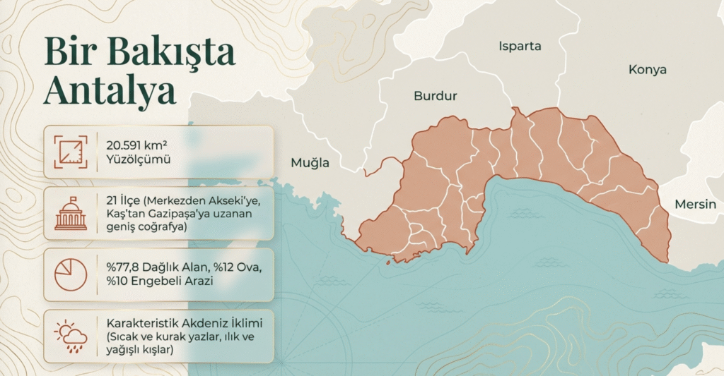 Dağlar, vadiler, yaylalar, akarsular ve ovaların çokluğu ile dikkat çeken Antalya ili, Güney Anadolu Sıradağları Torosların batı bölümünde yer almaktadır.