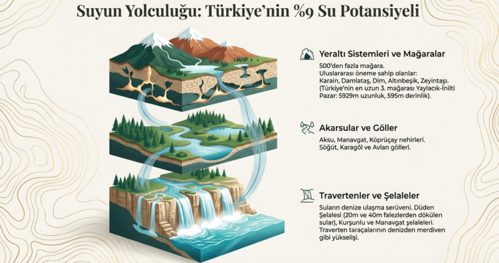 Bir kısmı denize, bir kısmı da göllere dökülen kentin başlıca akarsularından Aksu, Karpuzkaldıran, Manavgat, Varsak Köyü yakınlarındaki Düden Çayı’nın traverten taraçaları denizden merdiven basamakları şeklinde yükselerek bir doğa harikası görünümü oluşturmaktadır.