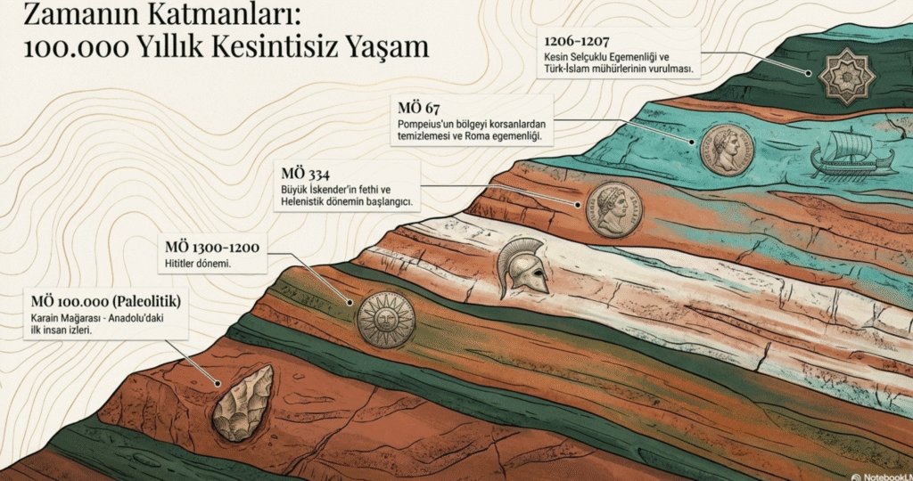 Anadolu’da ilk yerleşim yerlerinin başında gelen Karain Mağarası ile Antalya’nın tarihi MÖ 100 bin, paleolitik -yontma taş dönemine kadar gitmektedir.