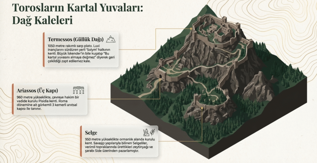 Kent tarihindeki en önemli olaylardan biri de; MÖ 333 yılında Anadolu’yu baştanbaşa kuşatan Büyük İskender, Termossos’u da almak istemiş ama halkının yiğitliği ile kentin engebeli arazisi birleşince zorlanmış ve “Bu kartal yuvasını almaya değmez” diyerek bu sevdasından vazgeçmesidir.