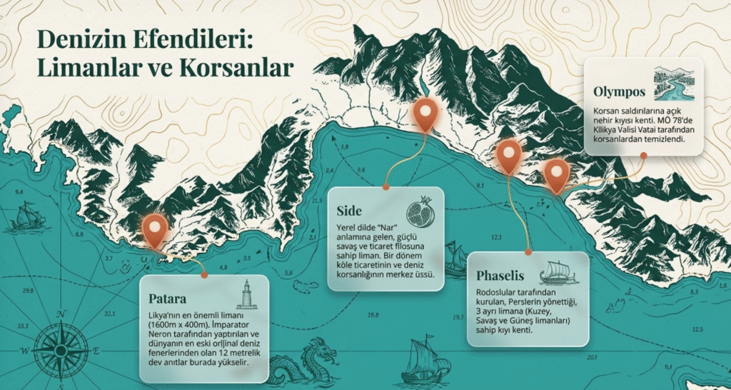 Kıyı ve limanlar kenti olan Phaselis, Likya döneminde en önemli doğu limanlarına- Kuzey Limanı, Savaş Limanı( Korunmuş Liman) ve Güneş Limanı- sahipti.