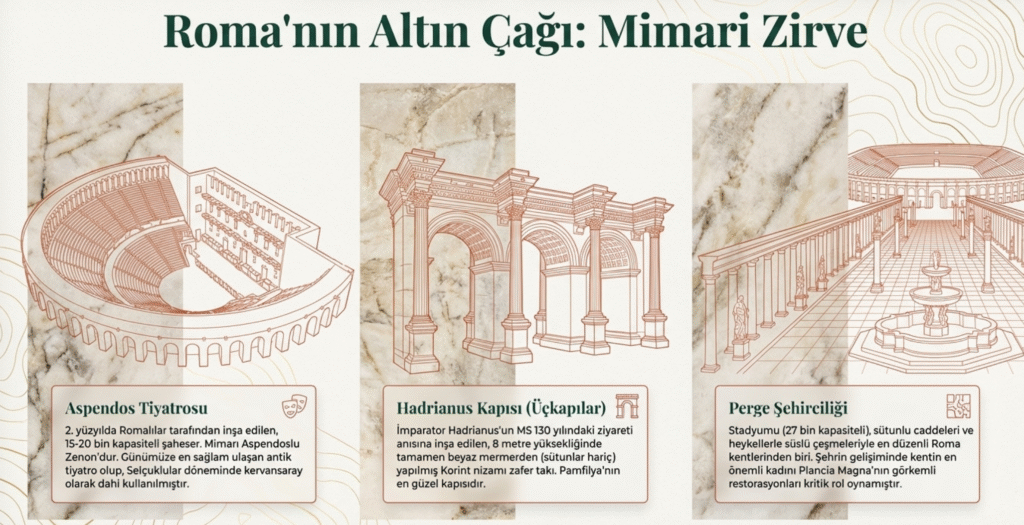 MÖ 130 yılında Hadrianus’un Attaleia’yı ziyaret etmesi ve yatırımlar yapması kentin tekrar gelişmesini sağlamıştır.