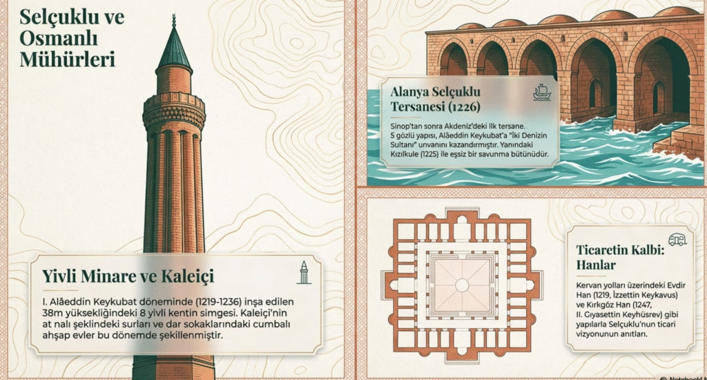 Antalya ve çevresinde geçmişten günümüze gelen çok sayıda Selçuklu ve Osmanlı dönemine ait tarihi yapılar-Gıyaseddin Keyhüsrev Medresesi, Zincirkıran Türbesi, Nigar Hatun Türbesi, İskele Cami- bulunmaktadır.
