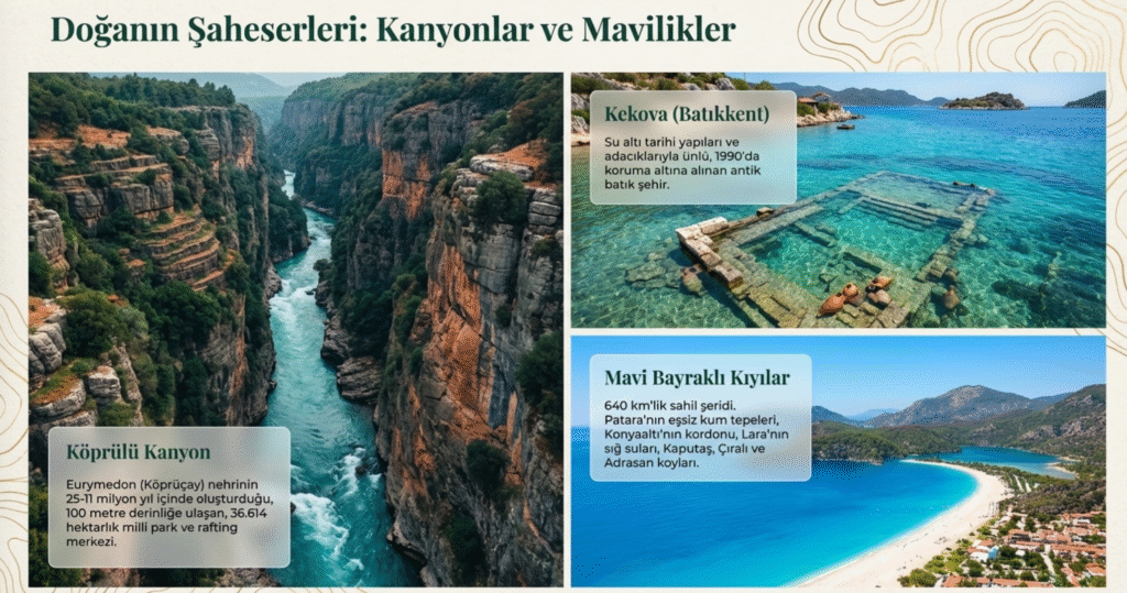 Antalya’nın 640 km girintili çıkıntılı, 500 km düpedüz plajlarla kaplı kıyısı bulunmaktadır. İl ve çevresi mavi bayraklı plajlar bakımından oldukça zengindir.