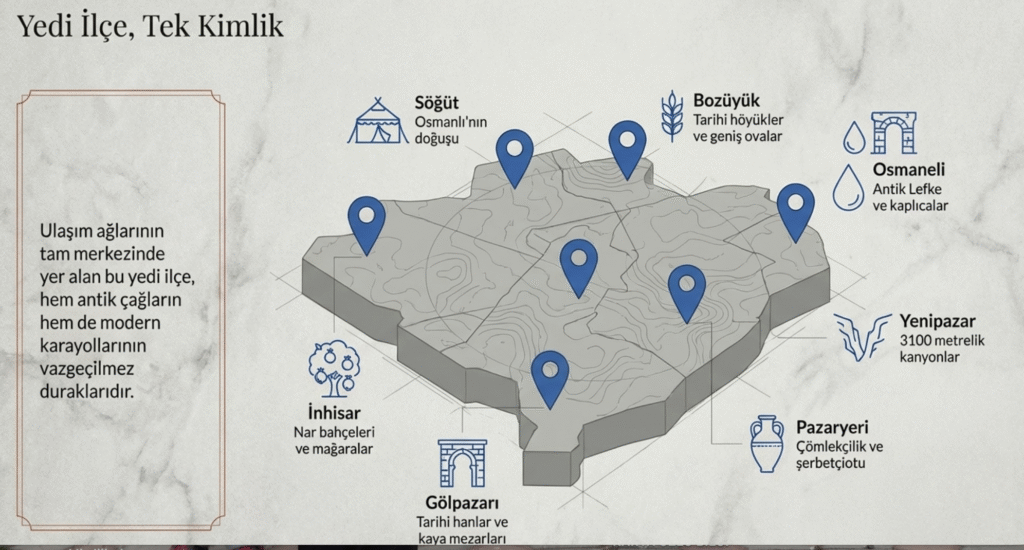 İlçeler Bozüyük, Gölpazarı, İnhisar, Osmaneli, Pazaryeri, Söğüt ve Yenipazar.