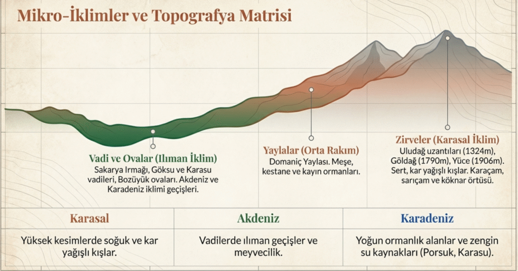 Dört farklı bölgede toprakları bulunan Bilecik’te iklim çeşitliliği- Akdeniz, Karadeniz ve İç Anadolu karasal iklim- görülmektedir.