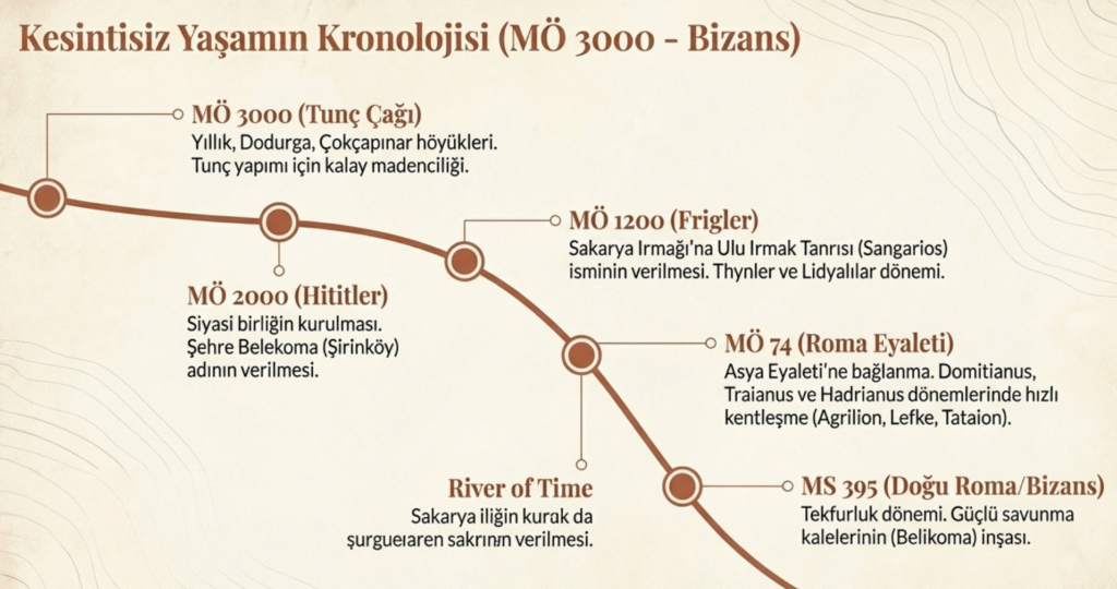 Bazı kaynaklarda MÖ 1950 yıllarında Trakya kavimlerinden Thynler’in de yaşadığı varsayılan Bilecik’te daha sonra Mısırlılar, Sakarya Irmağı’na Ulu Irmak Tanrı anlamında Sangarios diyen MÖ 1200 Frigler ardından Lidya, Kimmer ve Büyük İskender ile Makedon, Selevkos, Bergama Krallığı, Golatlar, M.Ö.280-74 Trakyalı Bithynia Ülkesi Nicomedia -İzmit yönetimleri egemen olmuşlardır.