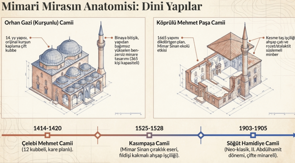 II. Abdülhamit tarafından onarılan Çelebi Mehmet Cami, 1525- 1528 yılları arasında Kasım Paşa tarafından klasik Osmanlı dini yapısı, Mimar Sinan’ın çıraklık dönemi yapıtlarından biri, kesme taştan, giriş kapısındaki ağaç işçiliği, fildişi kakmalarıyla dikkat çeken Kasımpaşa Cami ile Bozüyük -Kasımpaşa Cami ve İmareti, Gülpazar- Mihal Bey, Oba, Emirler, Akkaldırım camileri de bölgedeki önemli tarihi dini yapılardandır.