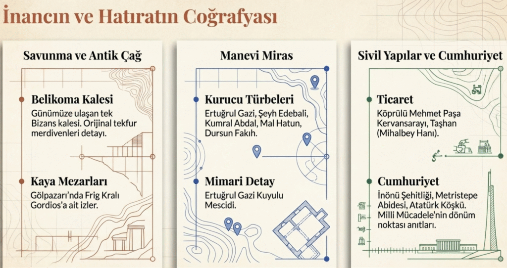Ayrıca Bilecik Kalesi, günümüze sadece dört duvarı kalan Köprülü Mehmet Paşa Kervansarayı, Kilise, Saat Kulesi, İnönü Şehitliği, Bozüyük-Atatürk Köşkü, Gölpazarı- Taşhan- Mihalbey Hanı, Gölpazarı- Frig Kralı Gordios’un Kaya Mezarı, Said Bey, Kaymakam ve Ayşe Hatun çeşmeleri ve Metristepe Abidesi de kentin tarihin farklı dönemlerine tanıklık eden önemli belgelerdir.