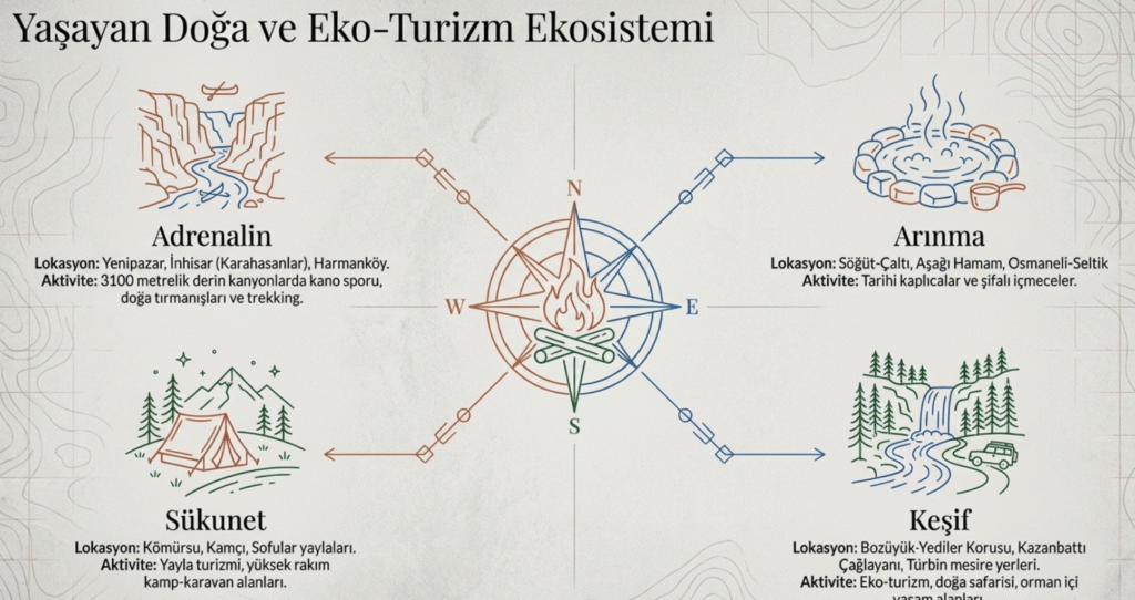 Bunlardan bazıları; Yenipazar, Karahasanlar- İnhisar, Harmanköy çevrelerinde 3100 m’lik kanyonları ile kano sporu, doğa yürüyüşleri ve tırmanışları, safariler, kamp- karavan alanları, ormanlık alanlar içinde eko- turizm için elverişli alanları, Bozüyük-Yediler Korusu, Başpınar ve Türbin mesire yeleri, Küsnük, Küslük çayırları, Abbaslık ve Bozcaarmut Köyü Ormanları, Kazanbattı Çağlayanı, Sofular, Kamçı ve Bozüyük- Kömürsu yaylaları ile Söğüt-Çaltı ve Aşağı Hamam kaplıcaları, Osmaneli- Seltik içmeleri önemli yerlerdir.