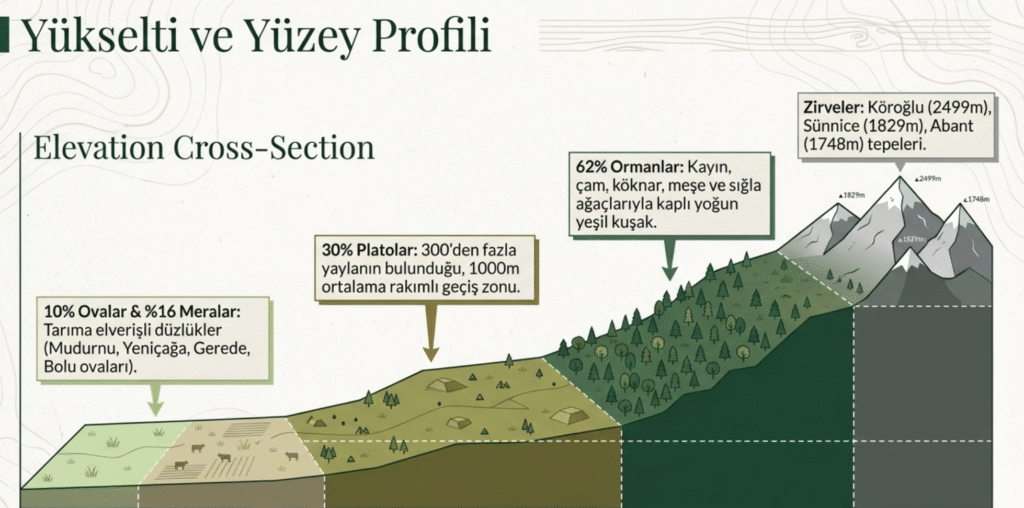 Denizden ortalama 1000 m yükseklikteki Bolu, sırtını 2499 m Köroğlu dağlarına yaslayan ve diğer dağ ile tepelerin yükseklikleri- 2400 m ile ve1577 m Bolu, 1829 m Sünnice, Orhan, Gül, Ardıç, Kocaman, Kapıorman, Elmacık ve Kaplan dağları ile 1980 m Çele, 1911 m Naldöken, 1486 m Kızıltepe, 1748 m Abant tepeleri– dikkat çekmektedir.