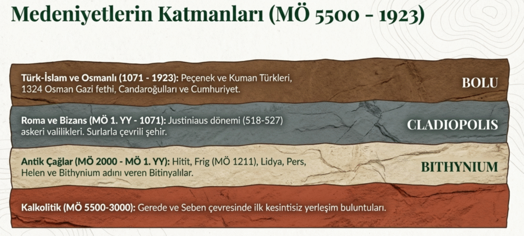 Bolu ili ve çevresinin tarihi kalkolitik döneme MÖ 5500- MÖ 3000 kadar gittiği yapılan araştırmalar sonucu ortaya çıkmıştır.