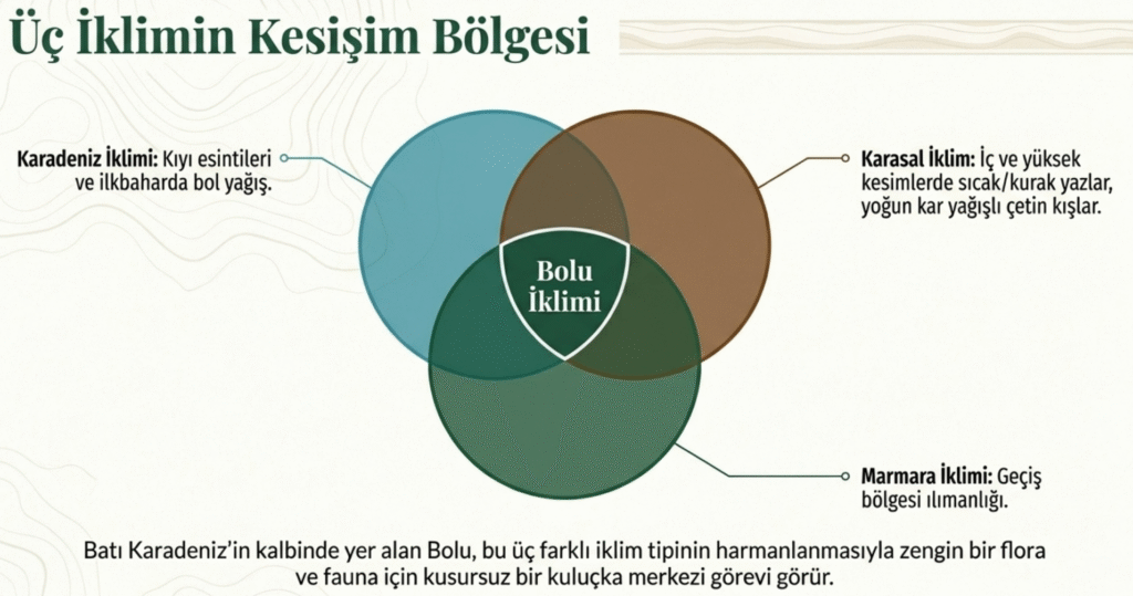 Batı Karadeniz illerinden biri olan Bolu’da karasal, Marmara ve Karadeniz iklim karışımı görülmektedir.