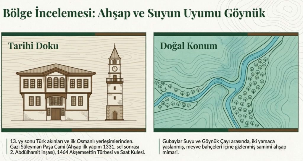 Bolu’ya 96 km uzaklıkta, iki nehir- Gubaylar Suyu ve Göynük Çayı- arasında, iki yamaca yaslı bir yerleşim yeri olan Göynük’ün meyve bahçeleri arasında ahşap evleri son derece doğal, ilgi çekici ve samimidirler.