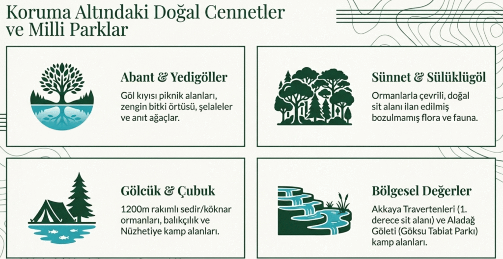 Gölleri, şelaleler ve anıt ağaçlarıyla dikkat çeken, yürüyüş, piknik ve kamp alanları bulunan Yedigöller ile irili ufaklı 120’den fazla göl ile doğal ortamları ve modern konaklama tesisleri çevresindeki doğal ormanlık alanlar, bitkileriyle dikkat çekerek koruma altına alınan Gölcük Tabiat Parkı da yine kente ait en çok ziyaret edilen yerlerin başında gelmektedir.