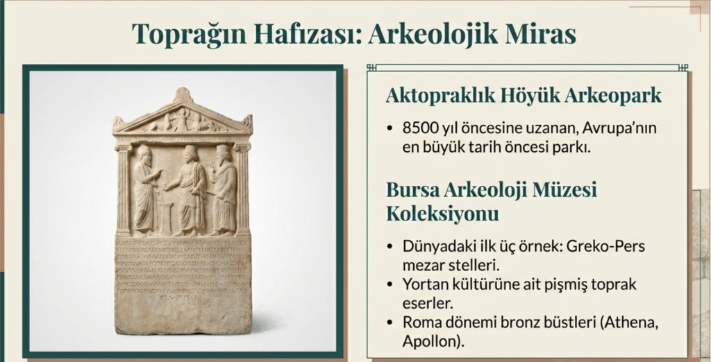 Bursa ve çevresinde bulunan arkeolojik eserler, 1904- 1972 yıllarında Erkek Lisesi’nde korunmuş, daha sonra Reşat Oyal Kültür Parkı’nda yapılan müze binasına taşınmıştır.