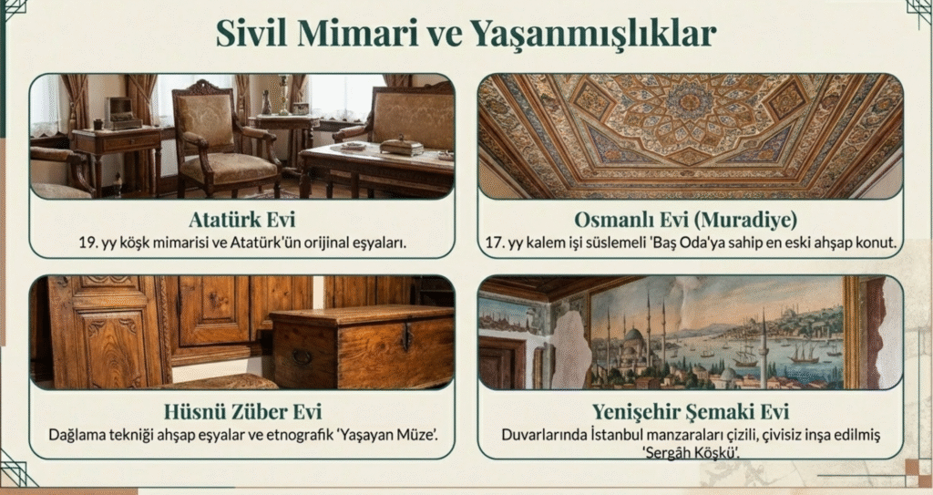 II. Murad Külliyesi’nin karşısında, Muradiye’de önceleri Sultan II. Murad’ın bir köşkü ve Fatih Sultan Mehmet’in doğduğu ev olduğu düşünülen yerde, Bursalı ustalar tarafından yapılmış bir sanat eseri gibi duran üç katlı ahşap ev, kentin en eski Osmanlı konutlarından kabul edilmektedir.