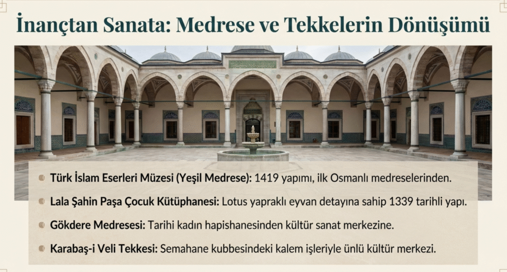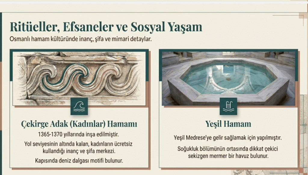 Bursa merkezi, Yeşil Caddesi’nde, Yeşil Medrese’ye gelir sağlamak için yapılan tekli şekilde düzenlenen, duvarların önünde sekiz adet kurna bulunan hamamın kare planlı ılıklığı ve tek kubbe ile örtülü soğukluk bölümünün ortasında sekizgen mermer bir havuz  dikkat çekmektedir.
