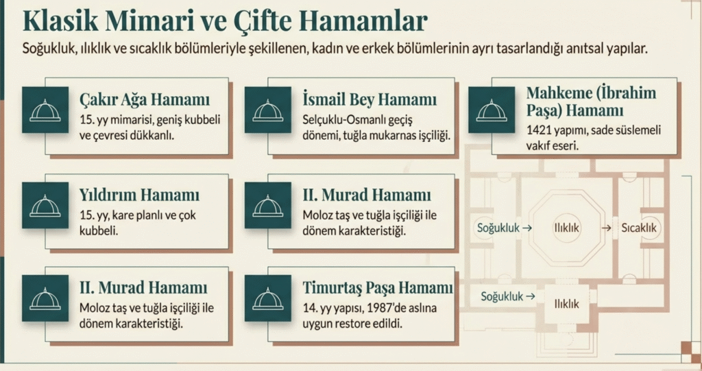 Bizans Hamamı olduğu düşünlen kalıntıların üzerine I. Murat tarafından 1394 yılında çifte hamam olarak taş ve tuğla malzeme ile yaptırılan binanın ortasında büyük bir şadırvan bulunmaktadır.
