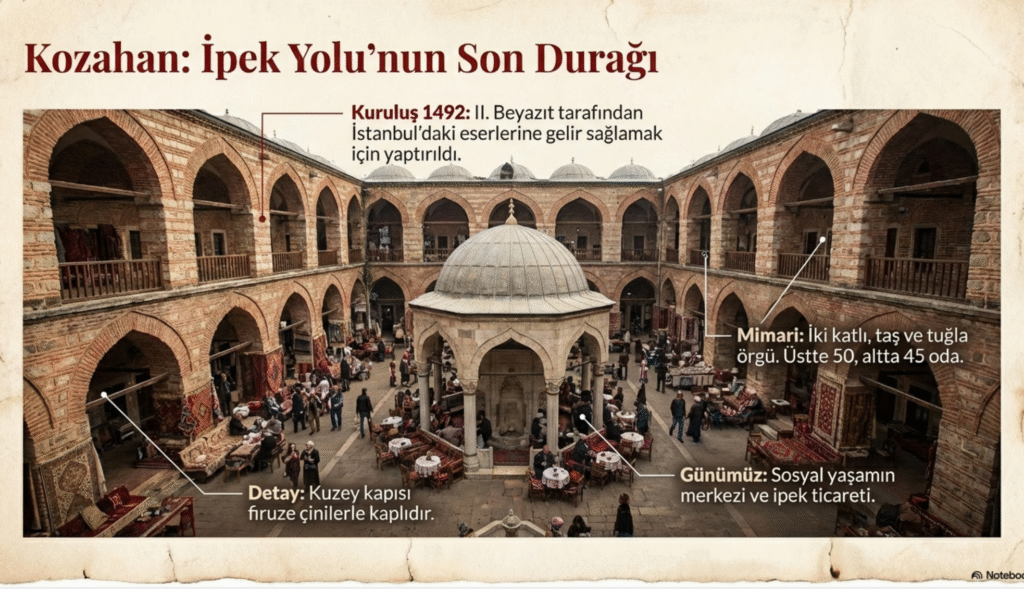 Orhan Cami ile Ulu Cami arasında yer alan Kozahan, II. Beyazıt zamanında İstanbul’daki cami ve medresesine gelir sağlamak için 1492 yılında, bir çeşit ticaret merkezi olarak yaptırılmıştır.