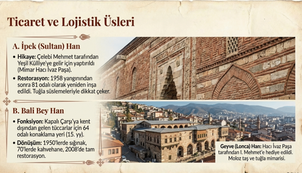 Ticaret yolları üzerine dizilen dönemin ihtiyaçlarına göre bölümlerden- odalar, depolar, mescit vb. oluşan hanlar, bedestenler gibi ekonominin nabzını oluştururlardı.
