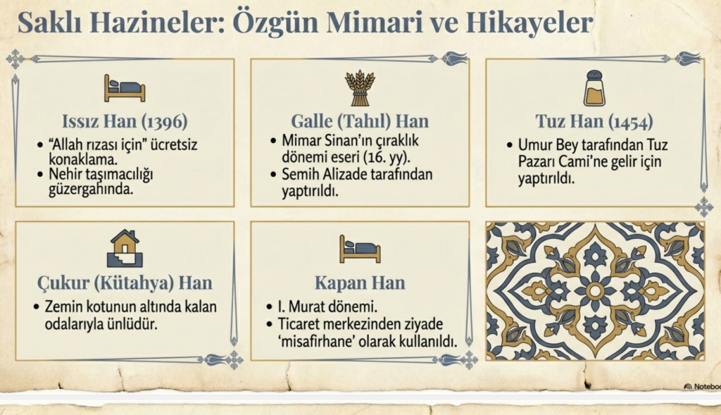 Mimar Sinan’ın çıraklık dönemi yapıtlarından olan iki katlı han, kentin en güzel 16. yy.’ın mimari özelliklerini yansıtmaktadır.