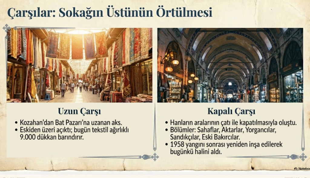 Kent merkezinin kuzey ve güney yönünde, elbiseciler, şekerciler, ayakkabıcılar ve bıçakçıların vb. dükkanlarla sıralı üzeri açık 15. yy.’da Kozahan’dan Bat Pazarı’na uzanan alanda yer alan çarşının üzeri açıktı.