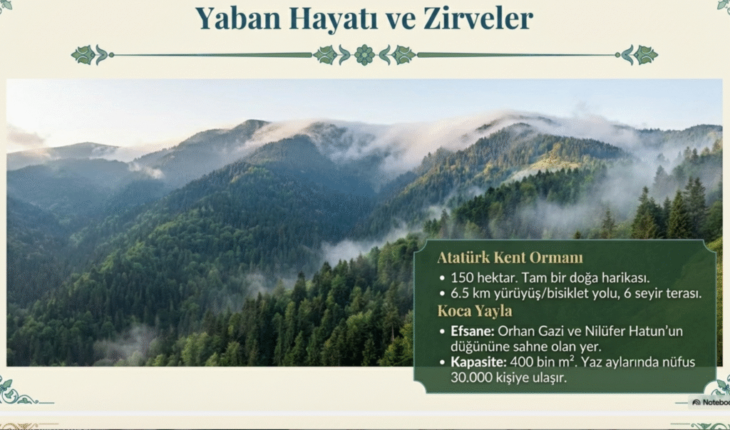 Bursa’ya içme suyu sağlayan Nilüfer Çayı yakınında yaklaşık 400 bin m2 lik alana yayılan, Orhan Gazi ve Nilüfer Hatun’un evlilik düğününe sahne olan yayla, halen önemli bir piknik alanıdır.