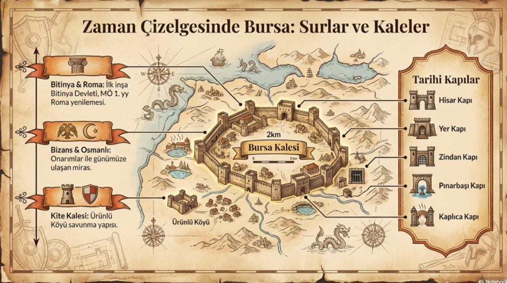 Bursa ve çevresinin de çeşitli dönemlere tanıklık eden diğer yapılardan özellikle Bitinya Devleti tarafından yaptırılan daha sonra MÖ 1. yy. da tekrar inşa edilen ve sonraki ulusların –Roma, Bizans ve Osmanlı- onardığı, iki burca sahip, halen 2 km uzunluktaki surları görülebilen, farklı yönlerden girilen 5 kapısı- Hisar, Yer, Zindan, Pınarbaşı, Kaplıca kapıları- bulunan Bursa Kalesi ile Kestel ve Ürünlü Köyü- Kite kaleleri de tarihi yapıların başında gelmektedir.
