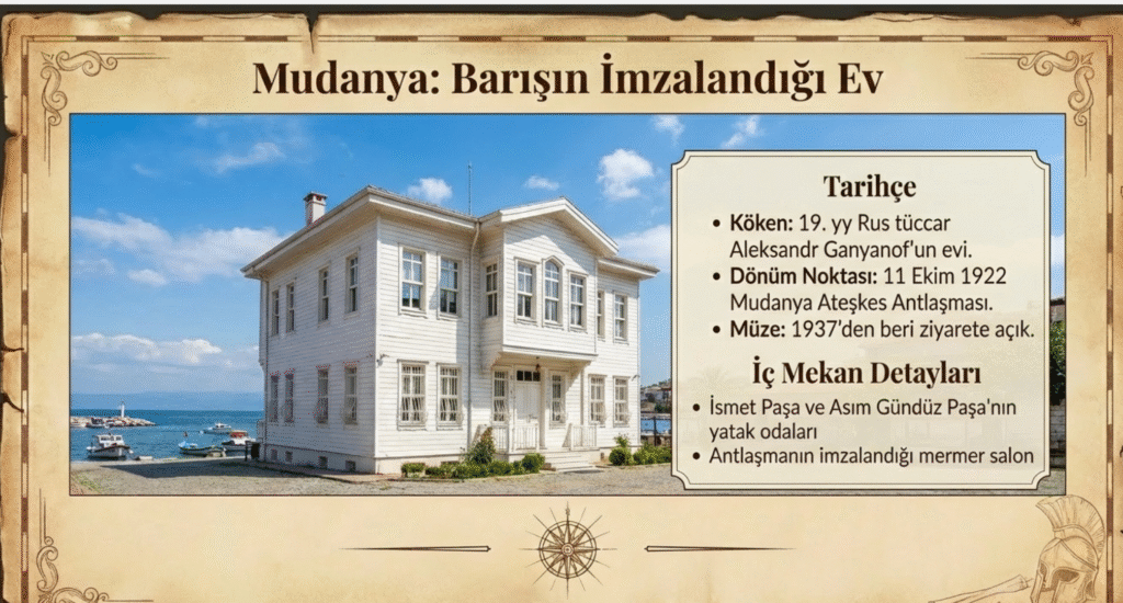Yeni Türkiye Cumhuriyet’in en önemli anlaşması 11 Ekim 1922 tarihli Mudanya Ateşkes Antlaşması’nın imzalandığı yer Mudanya’da, Rus asıllı tüccar Aleksandr Ganyanof’dan Hayri İpar tarafından satın alınan 19. yy.’da inşa edilen bina 1937 yılında müzeye çevrilmiştir.