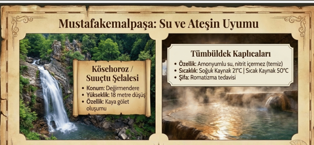 Mustafakemalpaşa’ya 15 km uzaklıktaki kaplıcaların soğuk su kaynağı 21°C, sıcak kaynak suyu ise 50°C’dir.