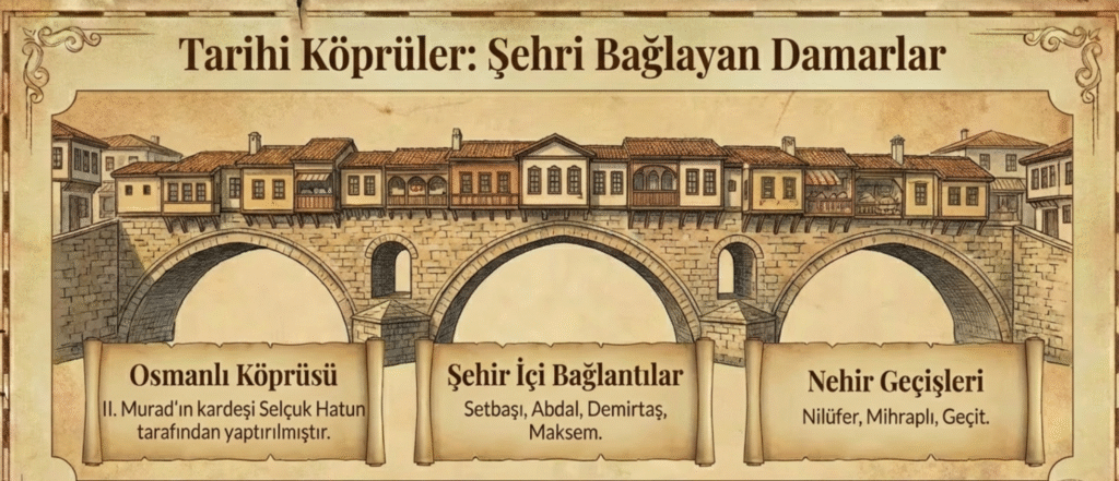 Ayrıca yine yolları, kentleri birbirine bağlayan köprülerden, II. Murad’ın kardeşi Selçuk Hatun tarafından yaptırılan Mutlu Evler yakınındaki Osmanlı Köprüsü, Kurşunlu Köyü, Demiroluk, Maksem, Setbaşı, Irgandı, Maydulak, Tatarlı, Demirtaş, Abdal, Geçit, Nilüfer ve Mihraplı köprüleri bulunmaktadır.