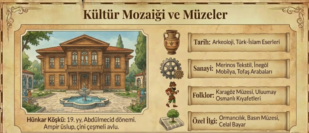 Kent ve çevresinde bölge tarihinin ve yörenin çeşitli parçalarını sergilediği için gezilmesi gereken çok sayıda müzeden- Arkeoloji, Türk İslâm Eserleri, Atatürk ve Kültür, Bursa Kent, Merinos Tekstil Sanayi, Karagöz, Ormancılık, Uluumay- Osmanlı Halk Kıyafetleri ve Takıları, Anadolu Arabaları, Hüsnü Züber Evi, Basın Müzesi, Bursa- Gemlik Celal Bayar, İnegöl Kent, ve İnegöl Mobilya Ağaç Sanayi müzeleri-bulunmaktadır.