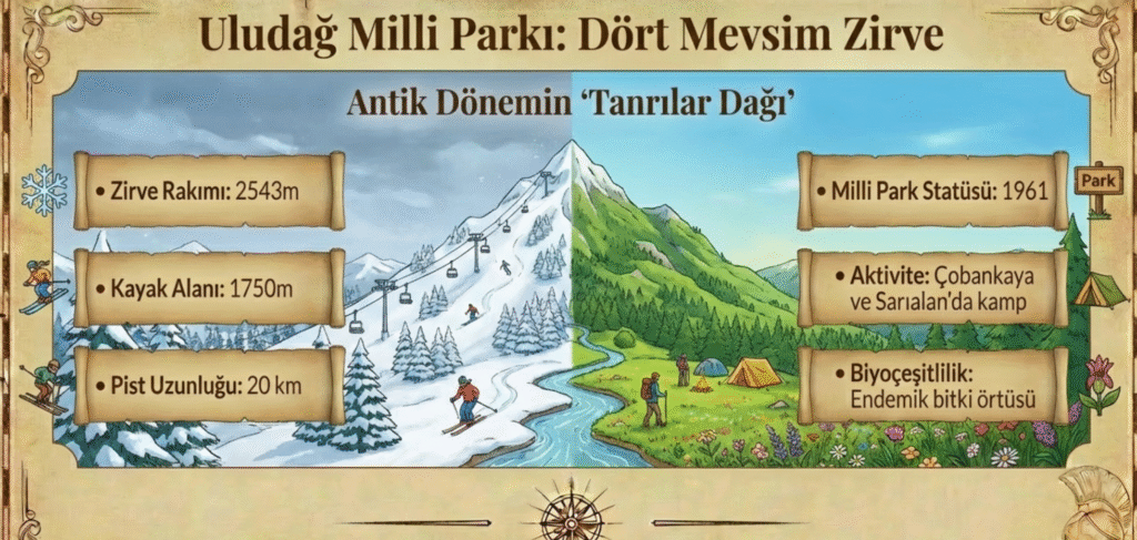 Tarihi yapı ve yapıtların yanında Bursa yakınlarındaki diğer önemli ve doğal alanların başında 2543 m yüksekliğinde, antik dönemde tanrıların oturduğuna inanılan altı dağdan biri, içinde çok sayıda doğal oluşum, ormanlık alanlar, yabani hayvanları barındıran Çobankaya, Sarılan, Bakacak ve Kiralıyayla olmak üzere çok sayıda kayak ve piknik alana sahip Uludağ Milli Parkı hem yazın hem de kışın çok sayıda ziyaretçiyi dağa ve dolayısıyla bölgeye çekmektedir. 1750 m yüksekte de kayak pistlerinin bulundu alanda toplam 20 km’lik parkurlar bulunmaktadır.