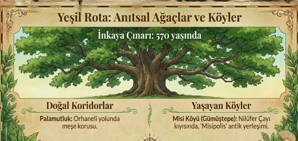 Bunun yanında Bursa tarihi ağaçları özellikle çınarlarıyla da tanınan bir ildir. Bu ağaçların en tanınanlarından biri de, Uludağ yolundaki İnkaya Köyü’ndeki 570 yaşındaki İnkaya Çınarı, Orhaneli yolunda meşe ağaçlarıyla çevrili Palamutluk, Karacabey- Bayramdere Ayı Koruma Bölgesi, Hayvanat Bahçesi ile her yıl binlerce kişi ziyaret etmektedir.