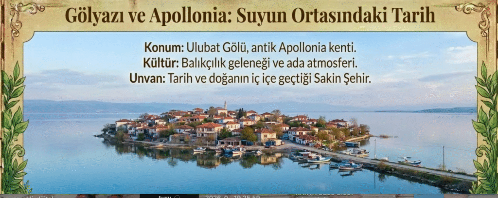 Ayrıca Ulubat Gölü kıyısındaki antik dönemdeki Apollonia Antik Kenti olan Gölyazı Beldesi hem doğal hem de tarihi değerleri bir arada taşıyan sakin bir yerleşim yeridir.
