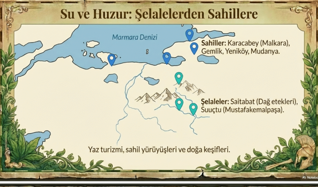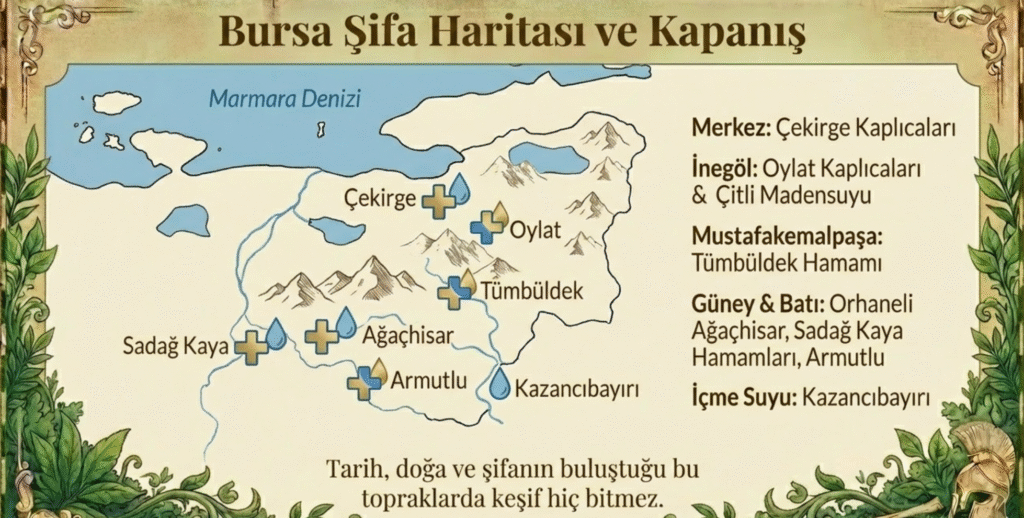 Bölge tarihi kadar doğal ve şifalı merkezler açısından da son derece zengindir. Bunlardan bazıları; Merkez- Çekirge, Vakıfbahçe Oylat, Mudanya- Bademlibahçe, Armutlu-Armutlu, Orhaneli-Ağaçhisar- Ağaçhisar kaplıcaları, Sadağ- Kaya hamamları, Mustafakemalpaşa- Dümbüldek Hamamı, İnegöl- Çitli Madensuyu, içme suyu ile dikkat çeken Kazancıbayırı’dır.