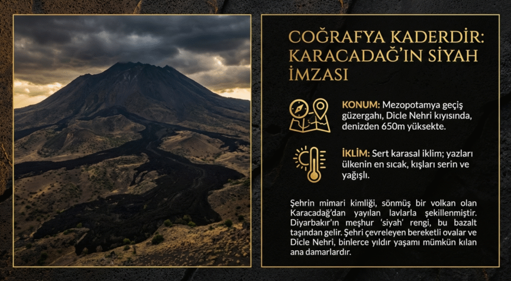 Denizden 600 m yüksekte,Dicle kıyısından 100 m yukarıda, Karacadağ lavlarında Fin kayası üzerindeki kurulu Diyarbakır’ın Mezopotamya geçiş güzergahında olması nedeniyle kentteki insanlık tarihi oldukça eski dönemlere uzanmaktadır.