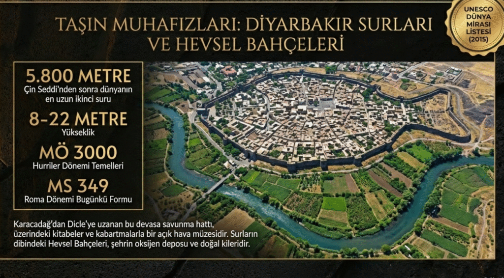 Yaklaşık 5600 yıl öncesine ait kaleleri çevreleyerek kenti tepeden görebilen, Karacadağ’dan Dicle Nehri’ne uzanan 1208 yılında yapıldığı tahmin edilen 5800 m uzunluğunda, 8 m – 20 m yüksekliğinde, 3m -12 m kalınlığında, Çin Seddi’nden sonra dünyanın en uzun surlarının üzerinde kentte yaşayan pek çok uygarlığa ait kabartmalar, taş oymalar, süslü anıtsal kapılar görülmektedir.