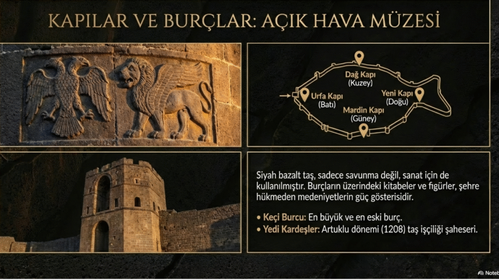 Siyah bazalt taşlarla farklı şekillerde- çokgen, kare ve yuvarlak- planlı 82 burcundan- Keçi, Yedi Kardeş, Ulu-Evli Beden, Dağkapı ve Nur burçları– önemlileri olan kale ve surlar içinde yaşayan bir kent olan Diyarbakır dört kapıyla- Kuzey- Dağkapı-( Harput), batı- Rum- (Urfa), güney- (Tel), Mardin, doğu- Dicle-( Sur, Şat)- Yeni kapları -ile dış dünyaya açılmaktadır.