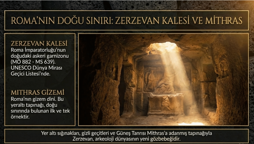 Roma’nın ezoterik ve gizem inancı, tören ve ayinleri gizli ışığın, savaşın, adaletin savunucusu Mithras (Güneş Tanrısı) dinine ait 1900 yıllık imparatorluğun doğu sınırındaki ilk kutsal alanı olan yeraltı, kaya oyma Mithras Tapınağı, Mithras’çıların kaldıkları yerler de bulunmuştur.