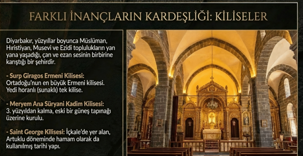 Diyarbakır ve çevresinde bulunan yapılardan, Hıristiyanlık dönemi; Mar Gevergis Nasturi Kilisesi, Mar Thoma, Kırklar, 3. yy. da Amirarzes Baseleios’un karısı Tamara tarafından, bazilika planlı olarak yaptırılan, ilgi çekici fresklere sahip Saint Georgi- Kara Papaz (George), Kırkdamaltı kiliseleri, 17. yy. da yapılan halen Katolik- Keldani mezhebi tarafından kullanılan Mar Petyun Keldani Katolik Kilisesi, Surp Sarkis Ermeni Ortodoks Kilisesi, Protestan Kilisesi, Çüngüş- Tekkale, Surp Asvadzadzin Ermeni Manastırı, Surp Garabed Ermeni Kilisesi, Çüngüş Köprüsü, Ali Bey Cami, Düden, Dicle- Kralkızı Taşı, Yukarı Cami, Pir Mansur Türbesi, Kral Kızı Barajı, Kadınlar Çeşmesi, Eğil- Süryani Kilisesi.