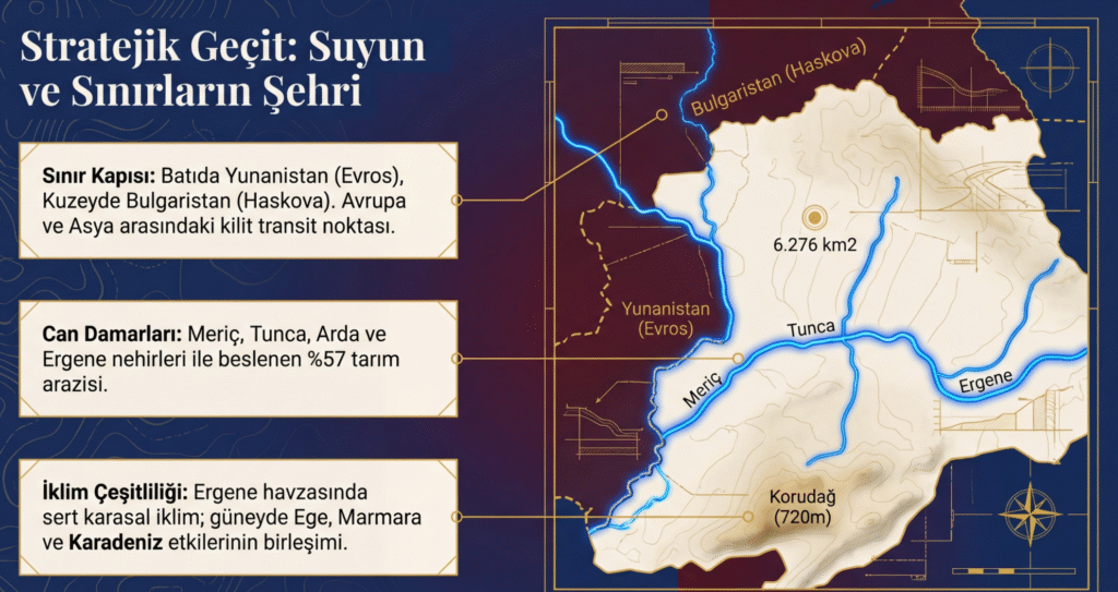 Komşular Edirne ilinin doğusunda Kırklareli ve Tekirdağ, güneyinde Çanakkale ve Eğe Denizi, batısında Evros- Yunanistan, kuzeyinde ise Haskova- Bulgaristan vardır.