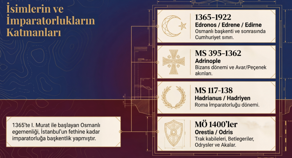 Trakların Orestia- Orestas, Makedonların Odris -Osrisia, Romalıların Hadrianusv- Hadriyen, Bizanslıların Adrinople olarak adlandırdıkları yerleşim yerine Türkler önce Edronos, Edrenabolu, Edrene demişler ve zamanla bu sözcük değişerek Edirne’ye dönüşmüştür.