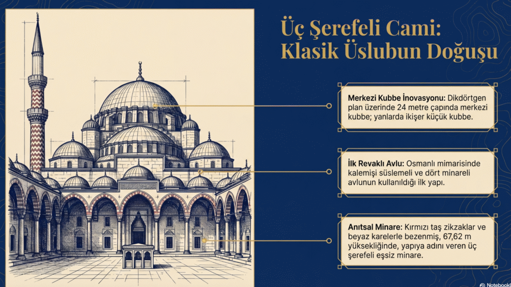 Ayrıca, Osmanlı döneminde, dört köşesinde dört minaresi olan kalemişi süslemeli revaklı avlu ilk kez bu camide kullanılmıştır.