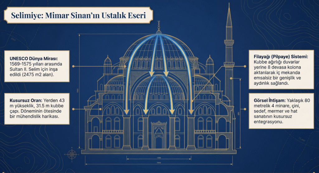 Sultan II. Selim tarafından Kıbrıs’ta elde edilen gelirlerle 1569-1575 yılları arasında, Mimar Sinan’a yaptırılan ülkede yapılan yapıların, külliyelerin en güzelidir.