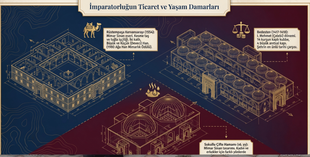 Arasta ve Bedestenler; Ali Paşa Arastası ve Çelebi Sultan Paşa Bedesteni, Hamamlar; Topkapı, Saray, Gazi Mihail Bey ve Tahta Kale hamamları ve Kırıkköy Dikilitaşlarının yanında Kırkpınar güreşlerinin yapıldığı Sarayiçi, Karaağaç yolundaki Söğütlük, Kapıkule, Bulgaristan sınır kapısıdır.