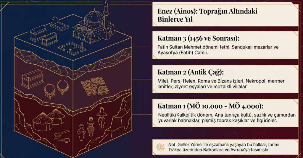 Enez’e bağlı en önemli ve ilk yerleşim yerlerinden Meriç’in denizle buluştuğu yerde, MÖ 4000 tarihlenen Ainos bir liman kenti idi.