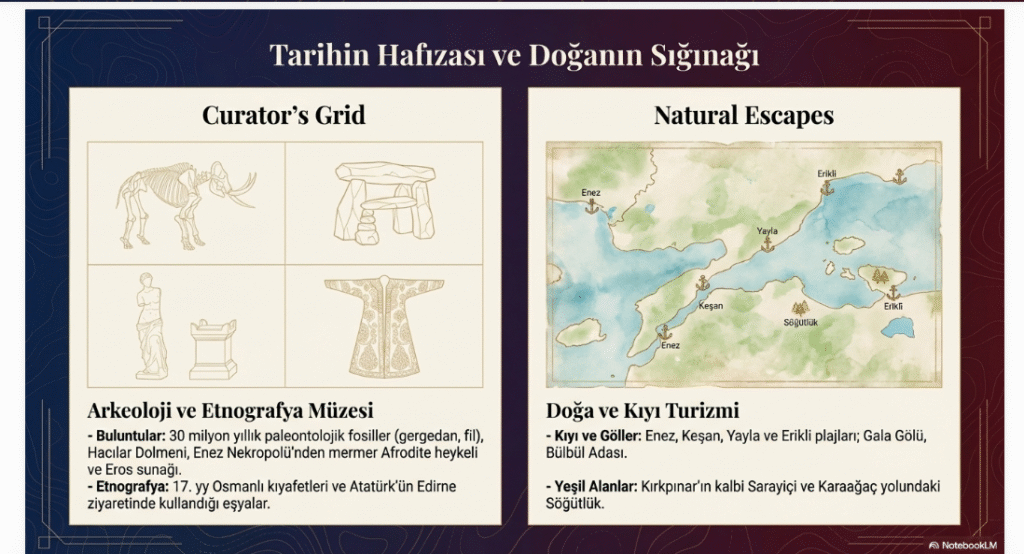 Arkeolojik bölümde, 3. zaman, paleontolojik – 30 milyon yıl öncesi dönem, orta neolitik- ilk kalkolitik MÖ 7300- MÖ 7400 Enez- Hocaçeşme Höyüğü, son tunç- demir çağı MÖ 1400-MÖ 800 Hacılar Dolmeni, Lalapaşa- Arpalık Dolmeni ve Taşlıcabayır Tümülüsü, Klasik- Helenistik-Roma ve Bizans ve Osmanlı dönemine kadar süren dönemlere ait buluntular- fil, gergedan at vb. ait kemikler, bitki fosilleri, taş-kil kaplar ile Enez- Nekropolü- Güzellik ve Aşk Tanrıçası Afrodite Heykeli, mermer, Eros Mermer Sunak, taş, bronz heykeller, lahitler, MÖ 8. yy. dolmenler- taş masalar, menhirler- uzun mezar taşları, sunaklar, hayvan figürleri, havuzlar vb.- sergilenmektedir.