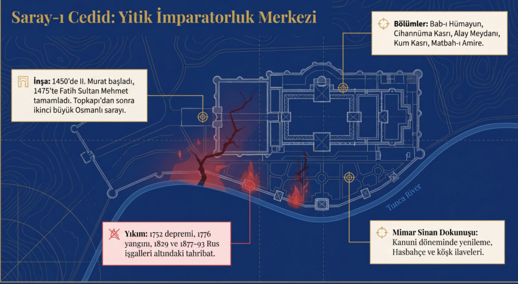 Tunca Nehri kıyısında, ormanlık alanda yaptırılan saray, Topkapı Sarayı’ndan sonra Osmanlı Dönemi’nin en büyük -300-355 bin m2- sarayı kabul edilmektedir.